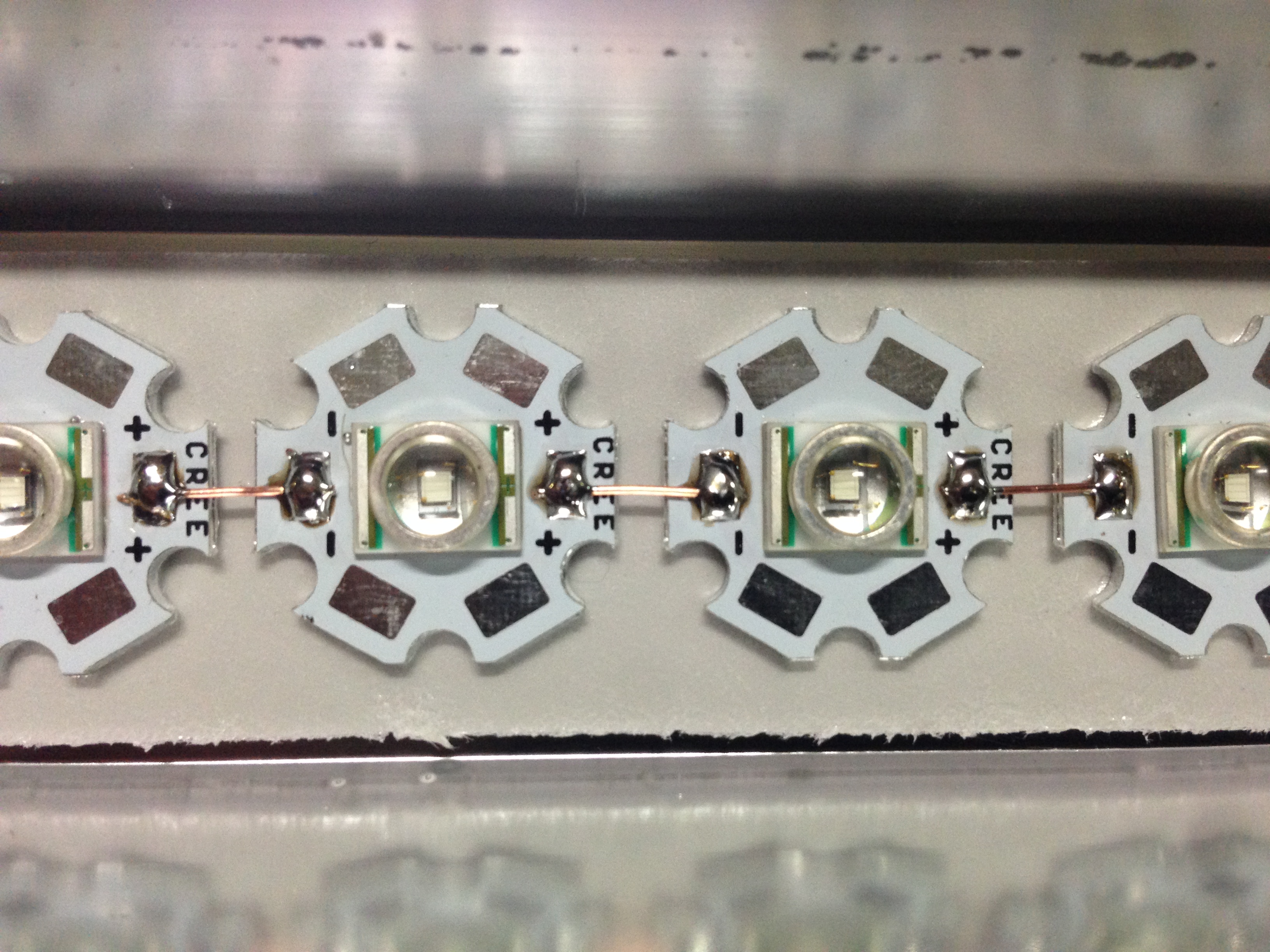 Abbiamo ultimato il sistema di fissaggio, possiamo dedicarci ad assemblare la barra con i relativi led: procediamo a pulire e sgrassare la superficie del dissipatore e applichiamo il biadesivo termico, facendolo aderire in maniera uniforme. Procediamo a sgrassare anche i pcb dei led e fissiamoli sul biadesivo, sarà sufficiente una leggera pressione per farli aderire. Ricordo che i led dovranno essere collegati in serie, quindi è opportuno incollarli in modo che il positivo di un led affacci sempre il negativo del led successivo.